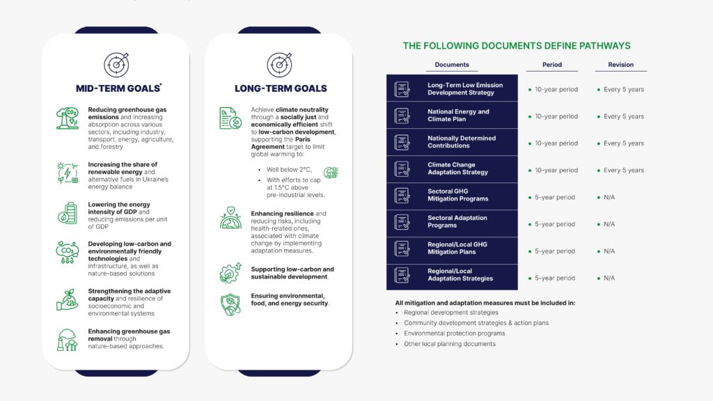 This infographic presents the core short-term and long-term climate policy goals of Ukraine. It outlines Ukraine’s targets for greenhouse gas emissions reduction, carbon neutrality, energy transition, adaptation, and climate resilience. These goals underscore the country’s commitment to aligning with European and global climate ambitions while building a sustainable and resilient future.