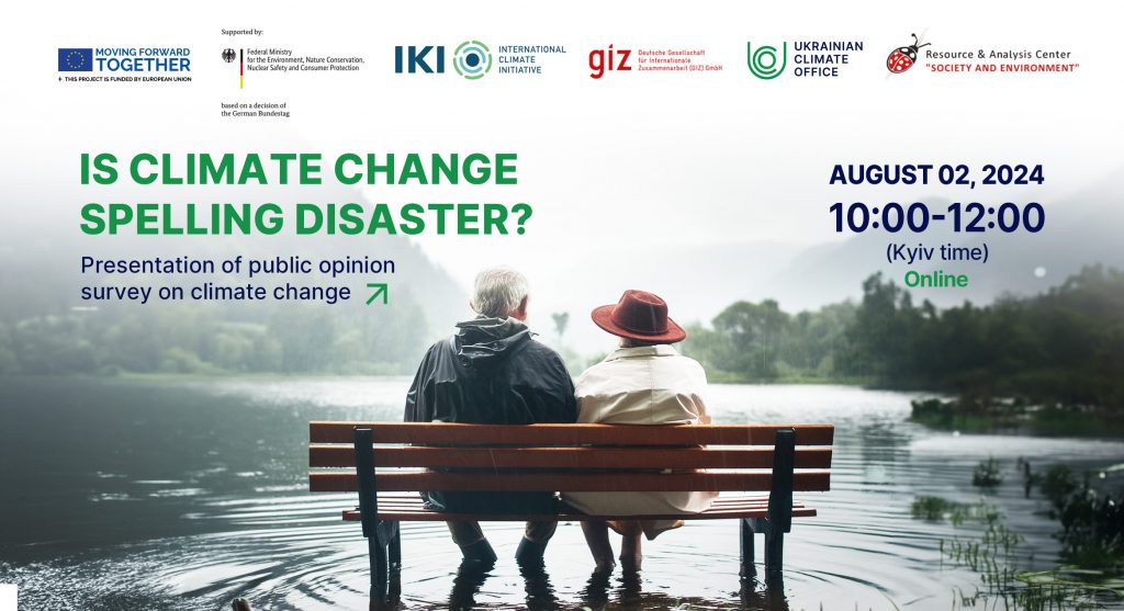 The Ukrainian Climate Office / C4CA Project together with the Resource and Analysis Center “Society and Environment” invite representatives of governmental, non-governmental and international organizations, scientific and educational institutions, donor organizations interested in climate change to an online presentation and discussion of the results of the study of public opinion on climate change. The event will take place online on August 02, 2024, from 10:00 to 12:00 (Kyiv time)/09:00-11:00 CET. Simultaneous Ukrainian-English translation will be provided during the event.