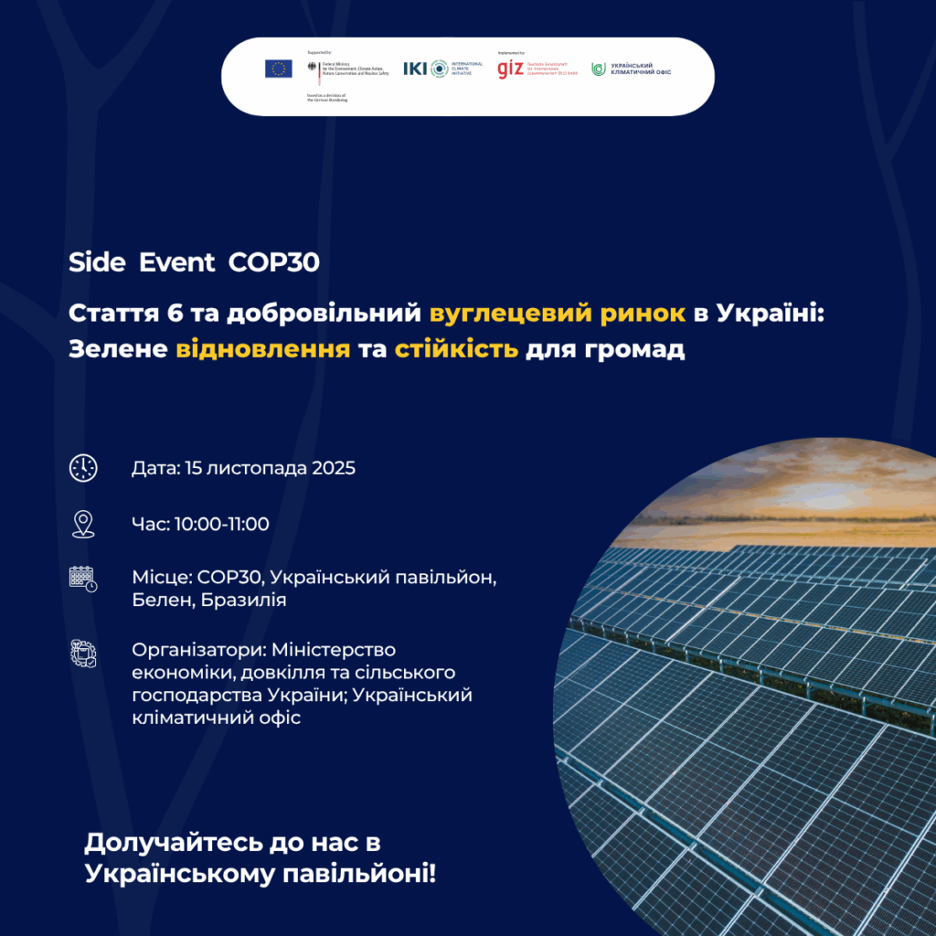 Долучайтеся до Українського кліматичного офісу на COP30 для цікавої дискусії про те, як вуглецеві ринки та механізми Статті 6 можуть сприяти зеленій відбудові України та зміцненню стійкості громад на шляху ...